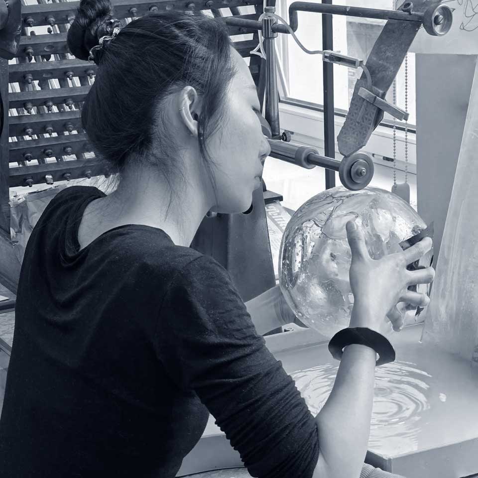 Dong-Min Lee, geboren in Südkorea, vereint in ihrer Arbeit eine fundierte Ausbildung in Gold- und Silberschmiedekunst, Produktdesign und Glasgravur, die sie unter anderem an der Akademie der Bildenden Künste Nürnberg und der Staatlichen Glasfachschule Zwiesel erwarb. 2025 absolvierte sie die Meisterprüfung erfolgreich. Ihre Kunst fängt flüchtige Momente in Glas ein – mit sanften Kurven, sinnlicher Schönheit und wahrer Eleganz, inspiriert von Motiven aus der Natur und Unterwasserwelt.
